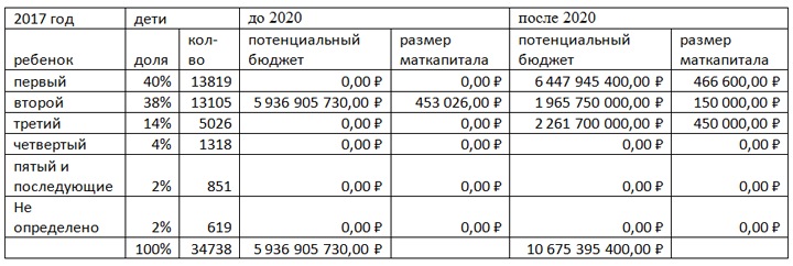 Попробуем экстраполировать новую схему выплаты материнского капитала, предложенную президентом, на структуру рождаемости 2017 года и сравнить суммы, которые должны были быть выделены на выплату материнского капитала по старой и могли бы быть выделены по новой схеме: