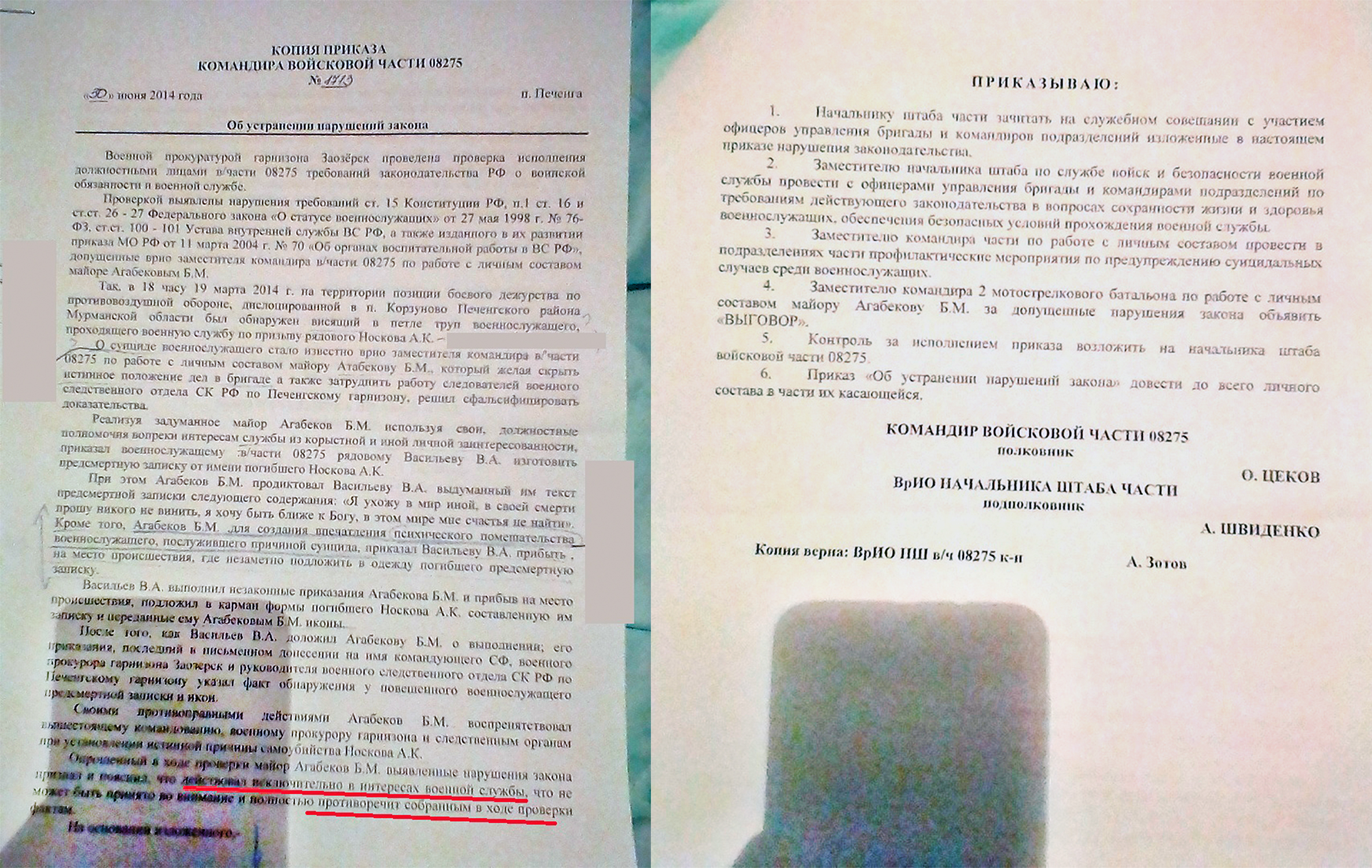 Майор Агабеков о записке командованию Северного флота, военному прокурору гарнизона Заозерск и в военный следственный отдел СК; позже ведомство сообщило о найденном письме публично, отчитываясь о возбуждении дела по статье о доведении до самоубийства (110 УК).