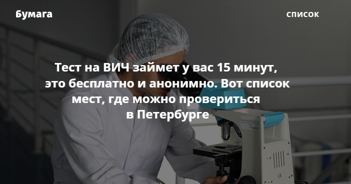 Экспресс-тесты, позволяющие узнать статус с точностью до 98 %, занимают не более 15 минут. Их делают бесплатно и анонимно. Специалисты рекомендуют сдавать анализы на вирус раз в полгода-год. «Бумага» публикует список мест, где можно провериться на ВИЧ в Петербурге.
