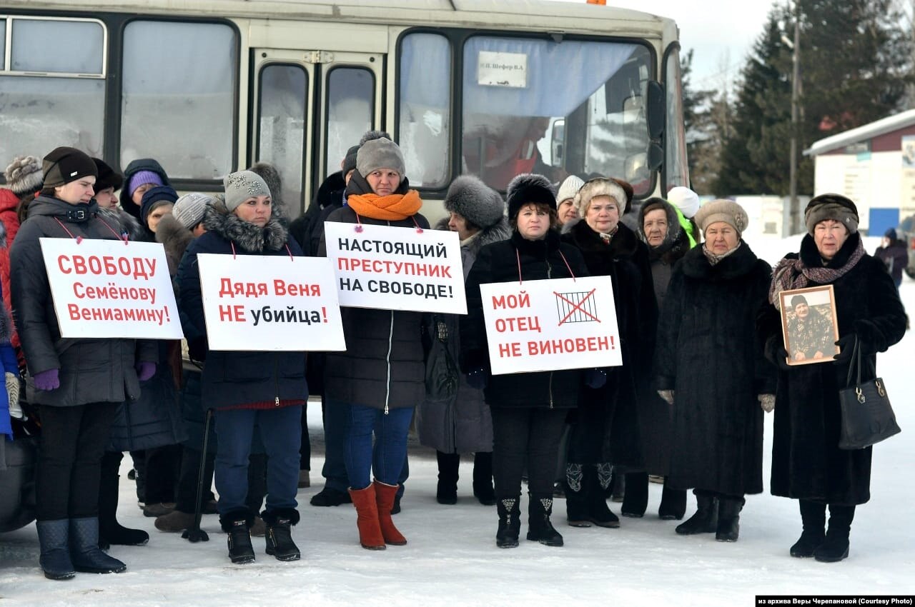 Несмотря на мороз в минус 25 градусов, протестующие простояли около часа на согласованной с властями акции в центре Лесосибирска. "Нас сопровождали шестеро полицейских. Все прошло в рамках закона: мы объявляли свои лозунги, рассказывали всем неравнодушным о нарушении закона в отношении моего отца. Среди людей, которые подходили к нашему митингу оказалось немало таких, кто тоже пострадал от бездействия местной полиции", - сообщила Черепанова. По словам организатора пикета, в доме ее отца, пока он спал, был обнаружен окровавленный труп другого жителя села – и вскоре без проведения экспертиз и вопреки показаниям свидетеля Вениамина Семенова объявили главным подозреваемым в убийстве. При этом в доме Семенова в ночь преступления находилось еще двое сельчан: один из них дал показания о побоях, которые убитому наносил второй.