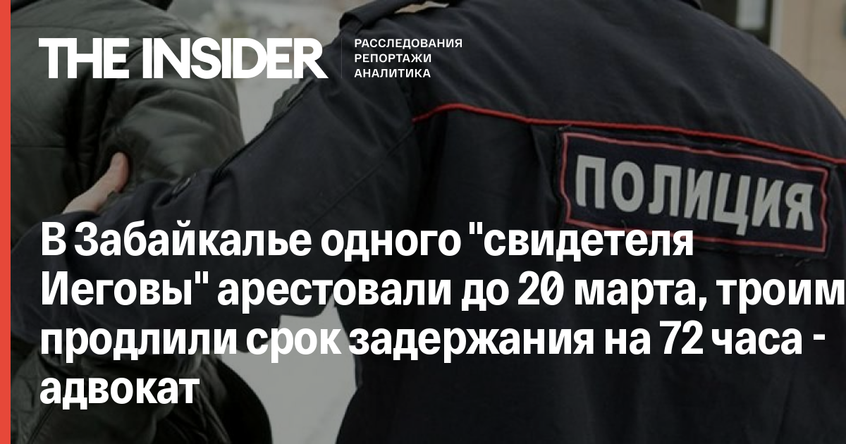 В Забайкалье одному из задержанных «свидетелей Иеговы» избрали меру пресечения в виде домашнего ареста до 20 марта. Еще троим продлили срок задержания на 72 часа. Об этом The Insider рассказал адвокат задержанных Артур Ганин.