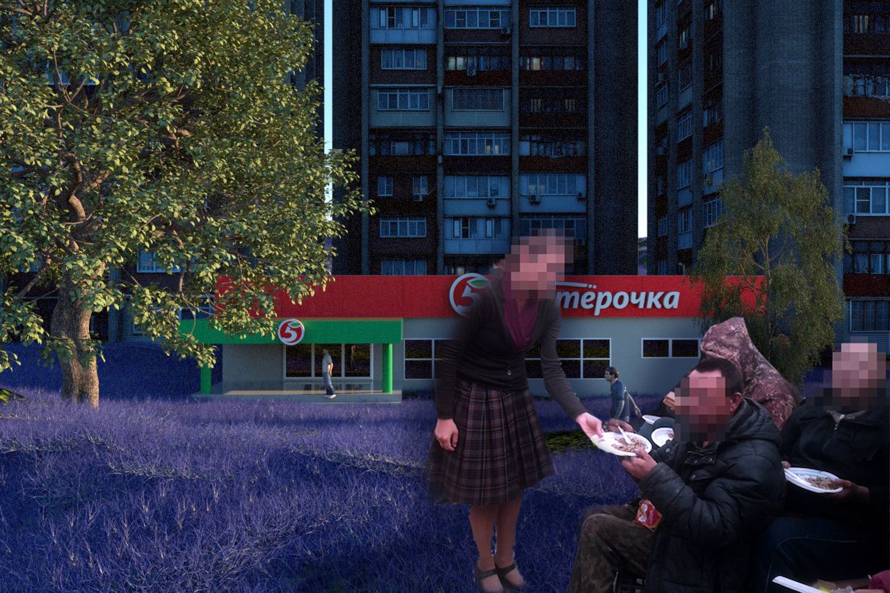 Мы проходим мимо вокзала, дальше — вдоль бизнес-центра. Наконец, я вижу магазин «Пятёрочка». Перед ним под деревом, на каких-то газетах, лежат двое, обнявшись. Они укрыты старыми куртками так, что я не вижу лиц — только переплетённые ноги. Рядом сидят Вика, Саша и пёс.