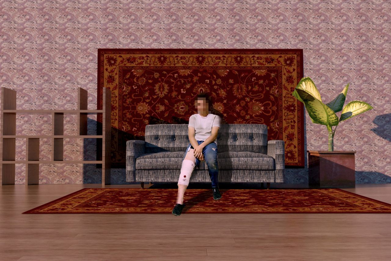 Слава сидит на диване, я немного вижу комнату. Она просторная, в самом конце стоит стол, а за ним — окно с тяжёлыми зелёными шторами и тюлем. На стене висит бордовый ковер. Мне очень непривычно наблюдать Славу в таком интерьере.