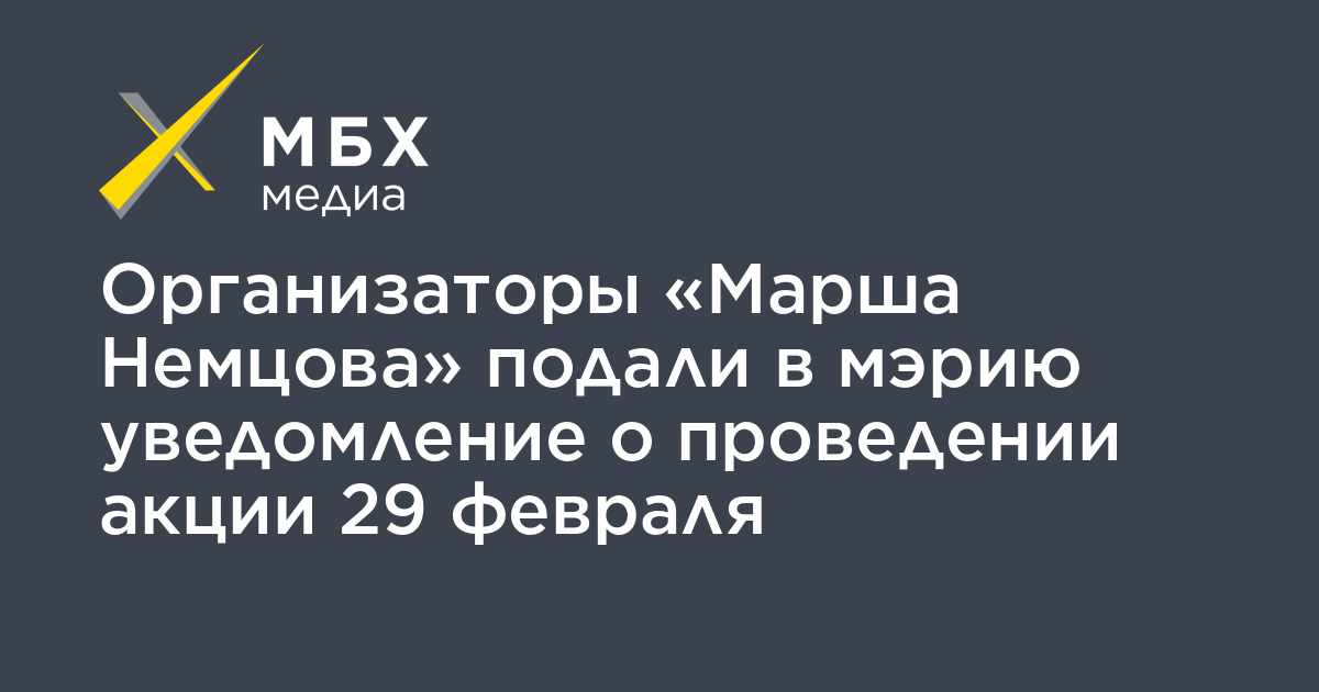 Организаторы «Марша Немцова» подали в мэрию Москвы уведомление о намерении провести акцию 29 февраля в 13.00, об этом «МБХ медиа» сообщил Илья Яшин.