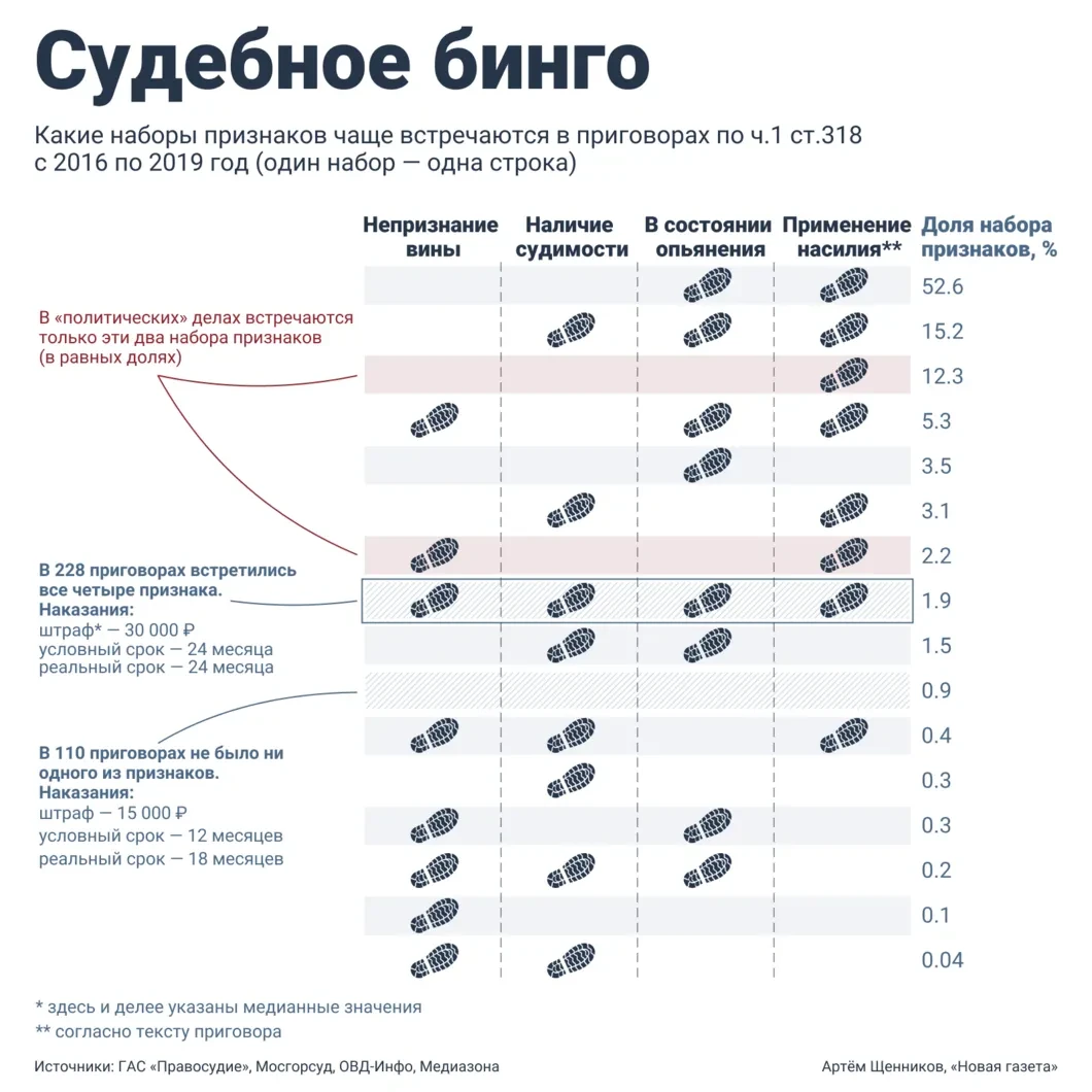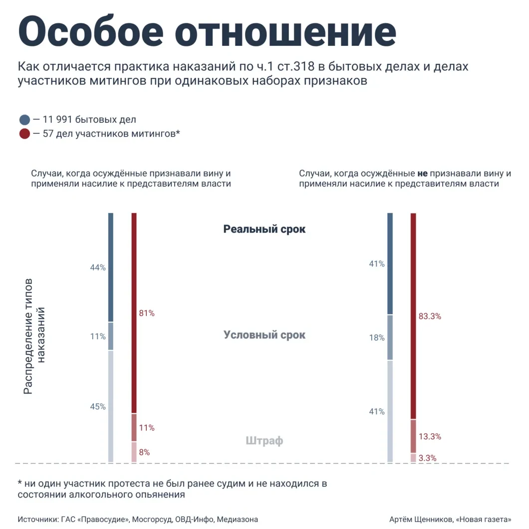 Ощущение несправедливости по отношению к фигурантам оказалось не безосновательным. Дата-отдел «Новой газеты» проанализировал 12 тысяч доступных судебных решений по части 1 статьи 318 УК и сравнил с приговорами, вынесенными участникам протеста: российский суд действительно склонен выносить именно протестующим более жесткие приговоры, чем обычно. Так, трезвые, ранее не судимые, участники митингов, обвиненные в применении насилия к представителям власти, чаще получают реальные сроки, чем условный пьяный дебошир с судимостью, который отбивался от полицейских.