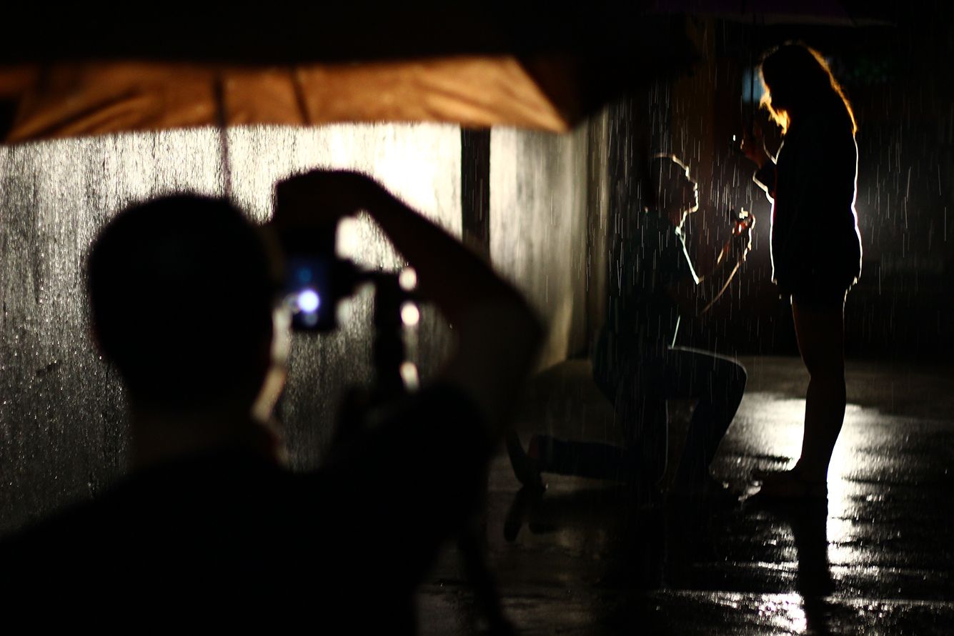 Мы начали печатать первые фото, моя роль была в том, чтобы я наблюдала за ними в кювете с реактивами и доставала, когда изображение достаточно закрепилось. Первые несколько фото были готовы, смотрю на них — ну просто какие-то деревья и дорога, ничего выразительного, говорю, что фото какие-то стремные. И вот в моем кювете оказывается очередной лист, изображение постепенно вырисовывается на моих глазах, и я вижу на фото своего парня, который держит в руках табличку с надписью «Выходи за меня».