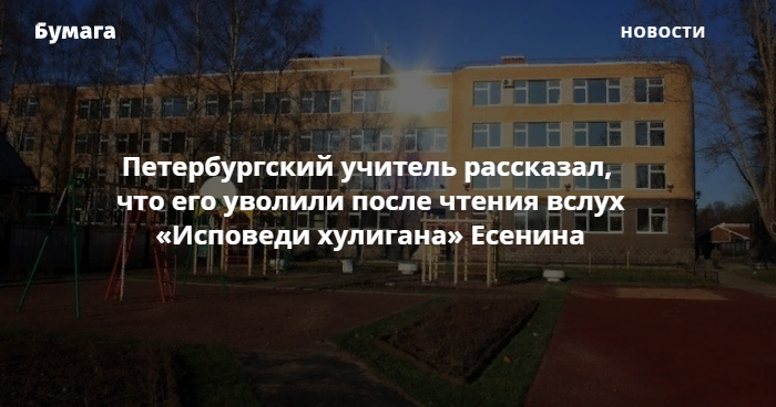 Учитель школы № 545 в Сестрорецке рассказал, что его попросили уволиться по собственному желанию после чтения на уроке у восьмого класса «Исповеди хулигана» Сергея Есенина. Внимание на это обратил «Пятый канал».