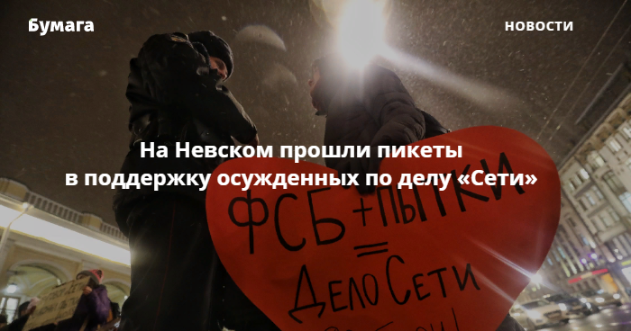 У станции метро «Гостиный двор» вечером 14 февраля прошли пикеты в поддержку осужденных и обвиняемых по делу «Сети», признанной террористической организацией.