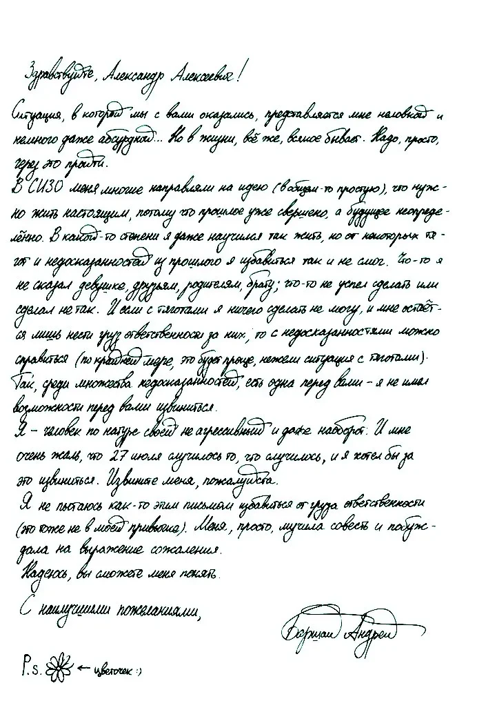 — А на письмо никакого ответа не было? Вообще, как вам кажется, в нем есть смысл, можно достучаться как-то до потерпевшего?
