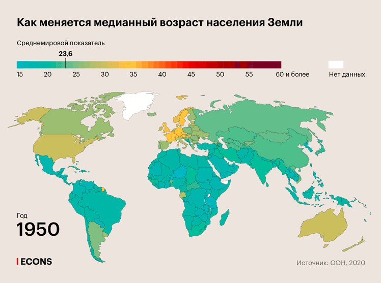 В 1950 году половина населения мира была младше 23 лет, к 2020 году медианный возраст возрос до 31 года, еще через два десятилетия он достигнет 36 лет. Во второй половине нынешнего века 50% людей в мире будут старше 40 лет, а к концу столетия в каждой пятой стране медианный возраст жителей превысит 50 лет.