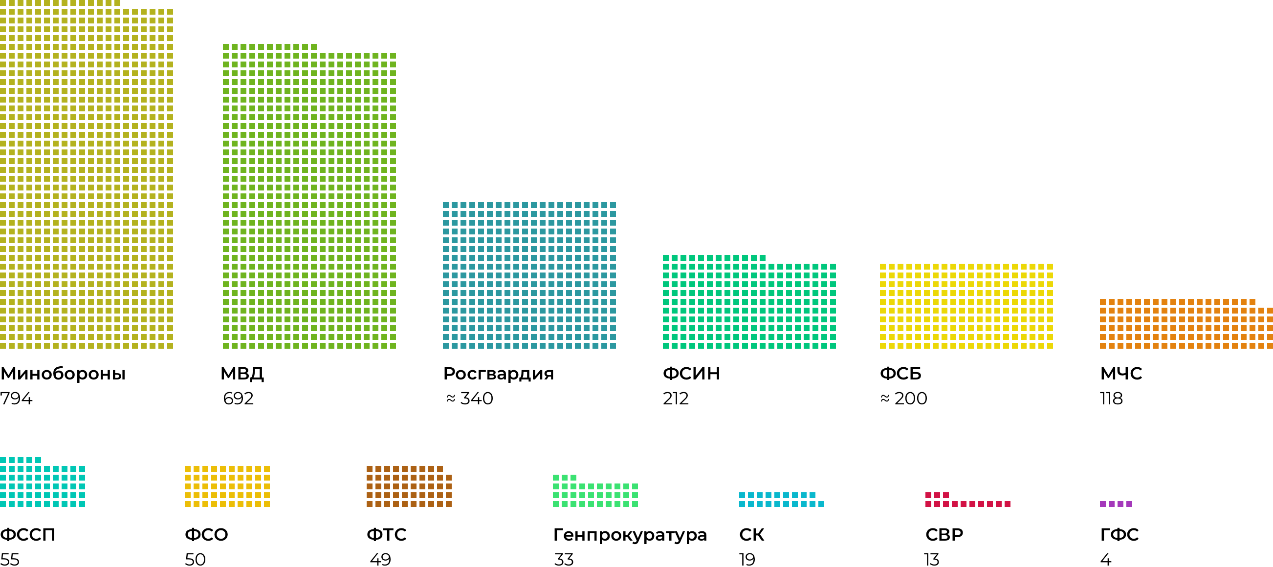 К силовикам мы отнесли представителей Министерства внутренних дел, Федеральной службы войск национальной гвардии, Министерства обороны, Федеральной службы безопасности, Федеральной службы охраны, Службы внешней разведки, Министерства по делам гражданской обороны, чрезвычайным ситуациям и ликвидации последствий стихийных бедствий, Следственного комитета, Генеральной прокуратуры, Федеральной службы исполнения наказаний, Федеральной службы судебных приставов, Федеральной таможенной службы и Государственной фельдъегерской службы.