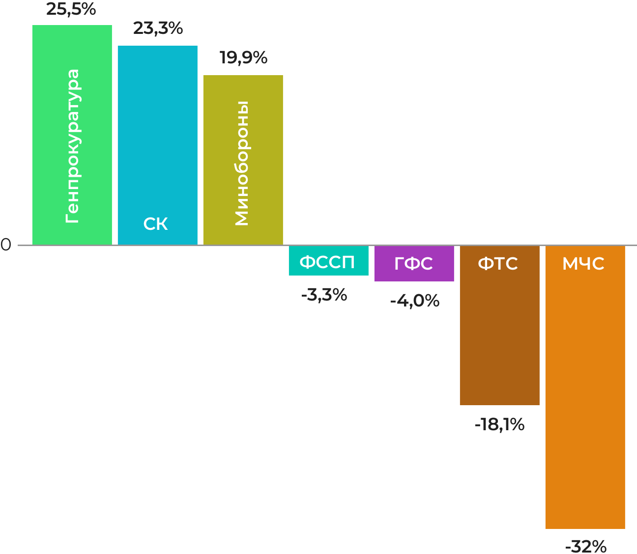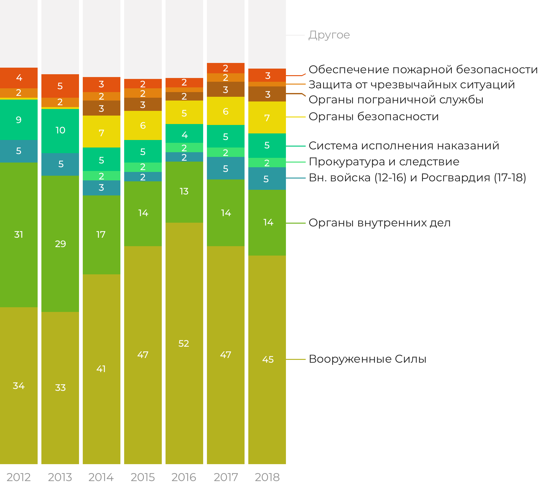 Численность остальных силовых ведомств сократилась по сравнению с 2012 годом , из тех силовых ведомств, статистика по которым доступна в динамике. Больше всего пострадали спасатели: в МЧС стало служить на 32% меньше персонала. Это единственная силовая структура в России, которая претерпела масштабные сокращения: в 2014-2018 годах в ведомстве происходила оптимизация персонала, которая привела к дефициту кадров , выяснилось в ходе внутреннего аудита МЧС в 2018 году. Ни одно другое силовое ведомство не потеряло такую же долю рабочей силы за это время. Для сравнения: на 18% сократилась численность персонала Федеральной таможенной службы. На 14% меньше по сравнению с 2015 годом , более ранние данные недоступны, стало сотрудников МВД, чему в некоторой мере способствовал перевод части сотрудников в новую структуру — Росгвардию , именно в 2017 году было заметно самое большое падение — на 8%. Число сотрудников уголовно-исполнительной системы и судебных приставов почти не изменилось: уменьшение составило всего 6% и 3%.