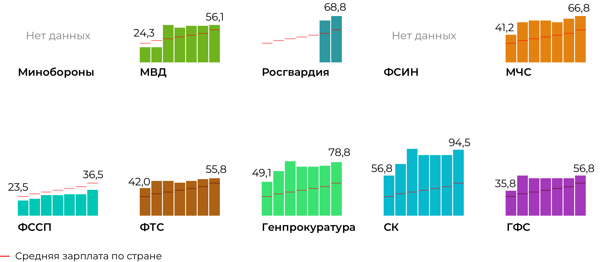 Служить на благо силового государства выгодно: во всех анализируемых нами ведомствах , для которых известна средняя зарплата средняя зарплата превышает средний уровень зарплаты по стране. Особенно прибыльно быть силовиком в федеральных аппаратах ведомств: там можно заработать в два-три раза больше, чем получают среднестатистические россияне.