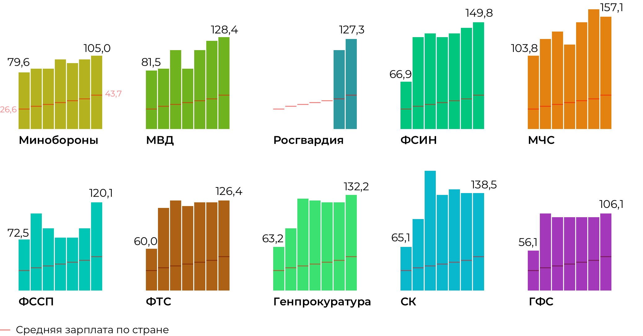 Самый большой разрыв от средней зарплаты по стране — у сотрудников МЧС: их средняя зарплата на федеральном уровне составляет 157 тыс. рублей, что в 3,6 раз больше, чем у среднестатистического жителя России. Вторые по величине разрыва — сотрудники Федеральной службы исполнения наказаний с зарплатой в 149 тыс. рублей, что в 3,4 раза выше, чем у среднего россиянина. В три раза больше, чем житель страны в среднем, получают прокуроры, полицейские, росгвардейцы и таможенники, в 2,4-2,7 раз — армия, приставы и фельдъегери.