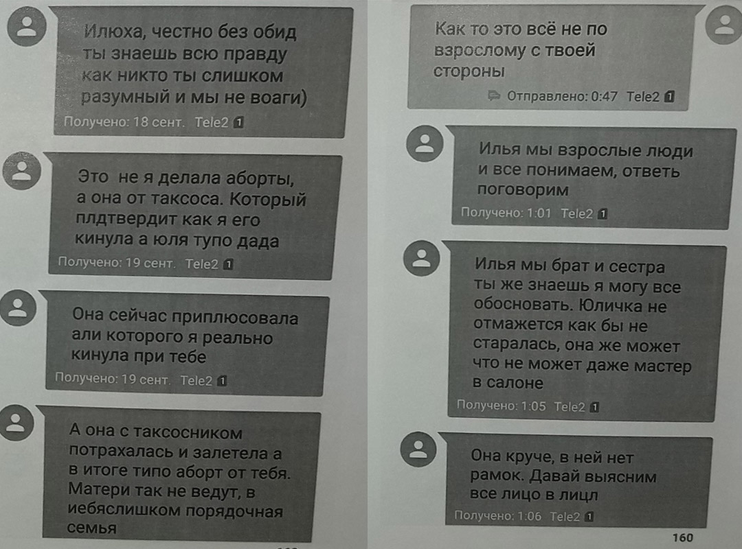 Пока одна компания осталась веселиться в «Дыме», Катя и Сергей писали Илье непонятные сообщения и несколько раз звонили. Юлия, девушка Ильи, не может объяснить эту переписку: «Обосновать Катин этот пьяный бред мы не смогли, поэтому Илья так и ответил».