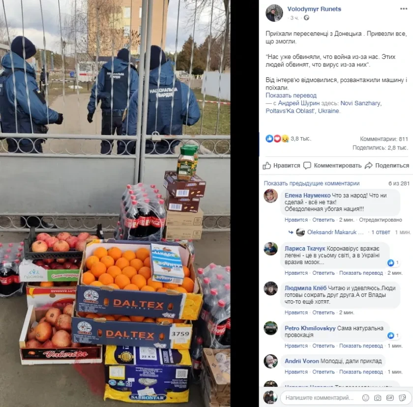 Корреспондент «Настоящего времени» Владимир Рунец сделал фото: к закрытым воротам приехали переселенцы из Донбасса. Оставили ящики с апельсинами и гранатами, упаковки газировки, шоколадок, банки кофе: «Нас уже обвиняли, что война из-за нас. Этих людей обвинят, что вирус из-за них».