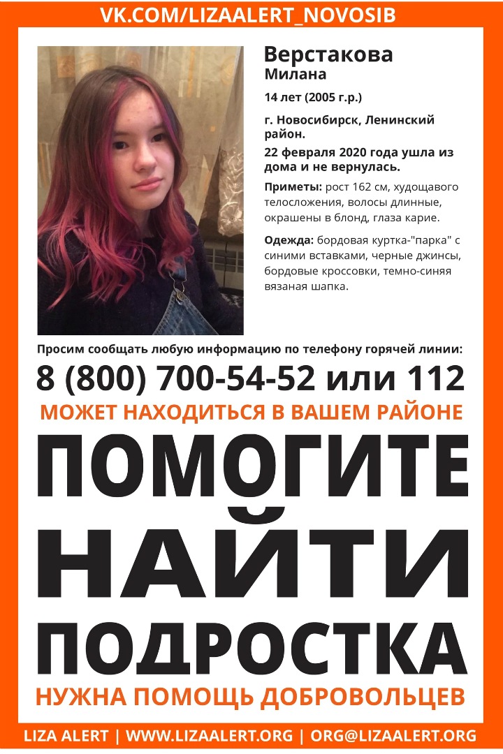 14-летняя Милана Верстакова пропала в Ленинском районе Новосибирска. 22 февраля она ушла из дома и не вернулась, сообщили волонтеры «Лизы Алерт»