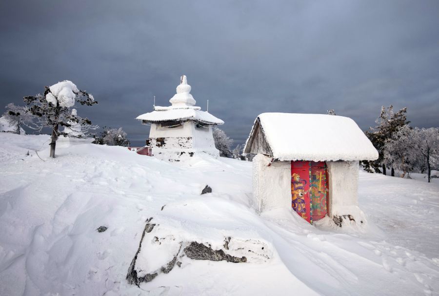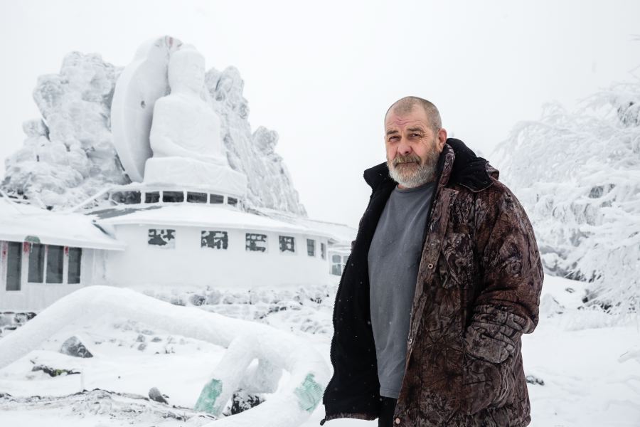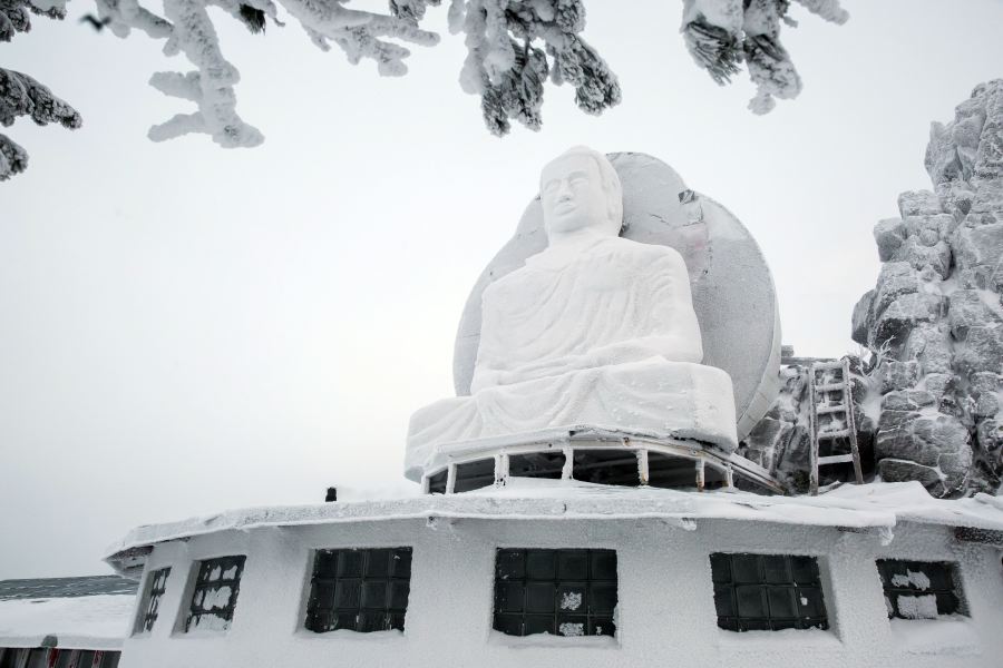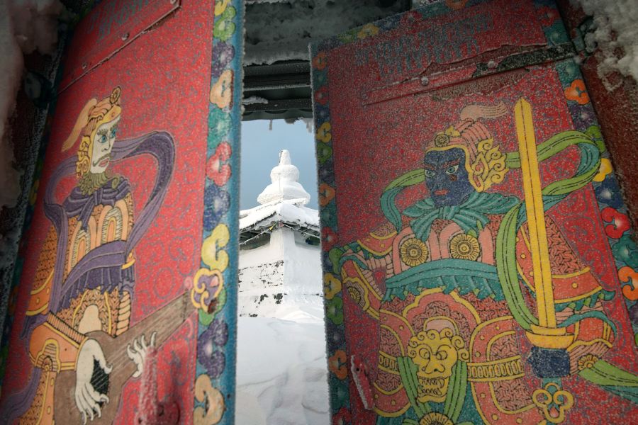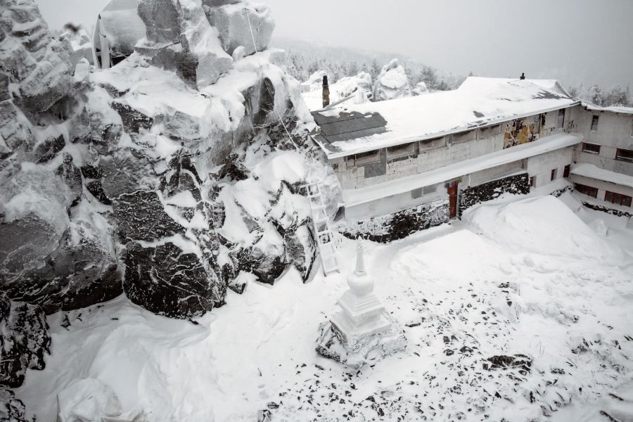 Он показывает мне небольшой пустующий домик для долговременных практик, где адепты проводят в одиночестве по несколько дней, подсобные помещения, пластикового дракона, которого к весне планируют декорировать цветами. Есть даже ветрогенератор — сейчас он не работает, потому что на лопастях намерзает лед. Когда мы отходим на несколько метров от монастыря, становится видна огромная статуя Будды на крыше реликвария. Ее установили в 2016 году — она выглядит монолитной, но на самом деле собрана из нескольких частей и покрыта всесезонной штукатуркой.