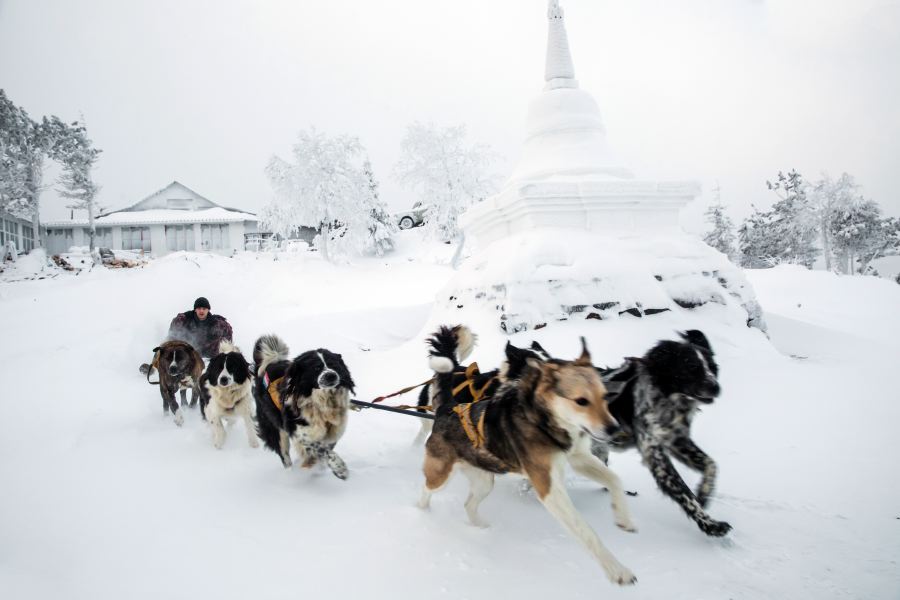 Упряжка из дворняг — куда более серьезное подспорье, чем может показаться. Сейчас в распоряжении общины появился вездеход Tinger, который накатывает зимнюю тропу, а раньше дорогу в снегу прокладывали с помощью упряжки и стройматериалы на гору подвозили исключительно на собачьей тяге.