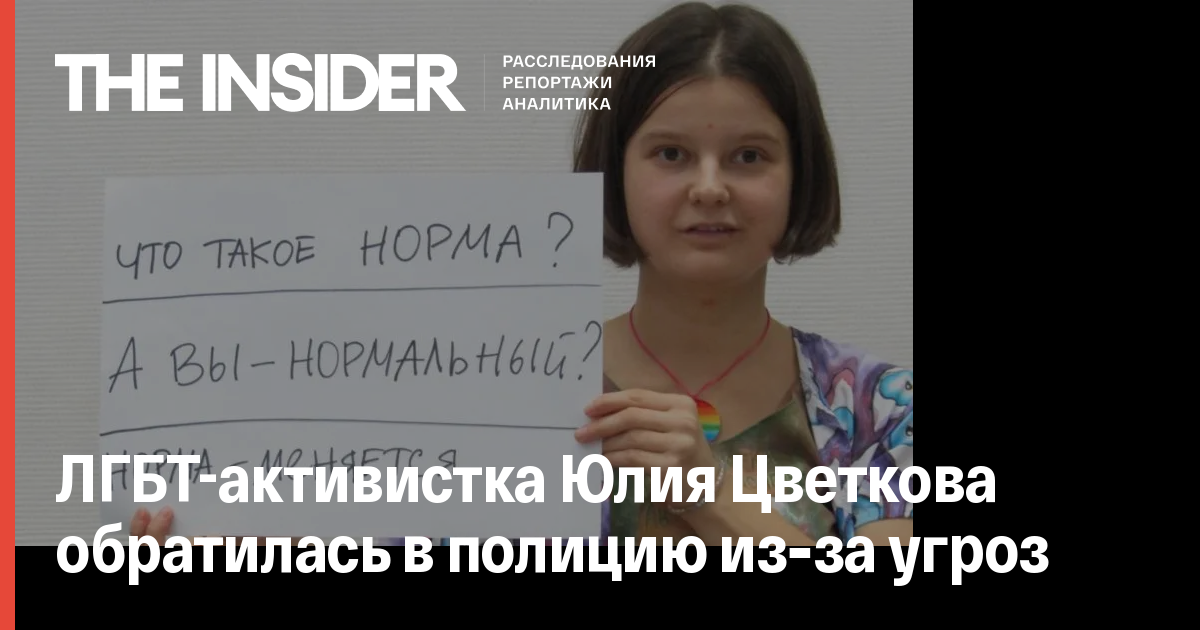 «Письмо от организации «Пила против ЛГБТ» пришло сегодня. До этого я была в списке «Пилы». А угрозы от разных людей поступают больше двух лет подряд. Сегодня я написала заявление в полицию про угрозы убийством. Летом 2019 года писала заявление, но тогда ничего не произошло. Не знаю, сможет ли меня защитить обращение в полицию, но намерена добиваться, чтобы на угрозы обратили внимание и приняли меры. А чувствую я сейчас злость», — отметила Юлия Цветкова в разговоре с The Insider.