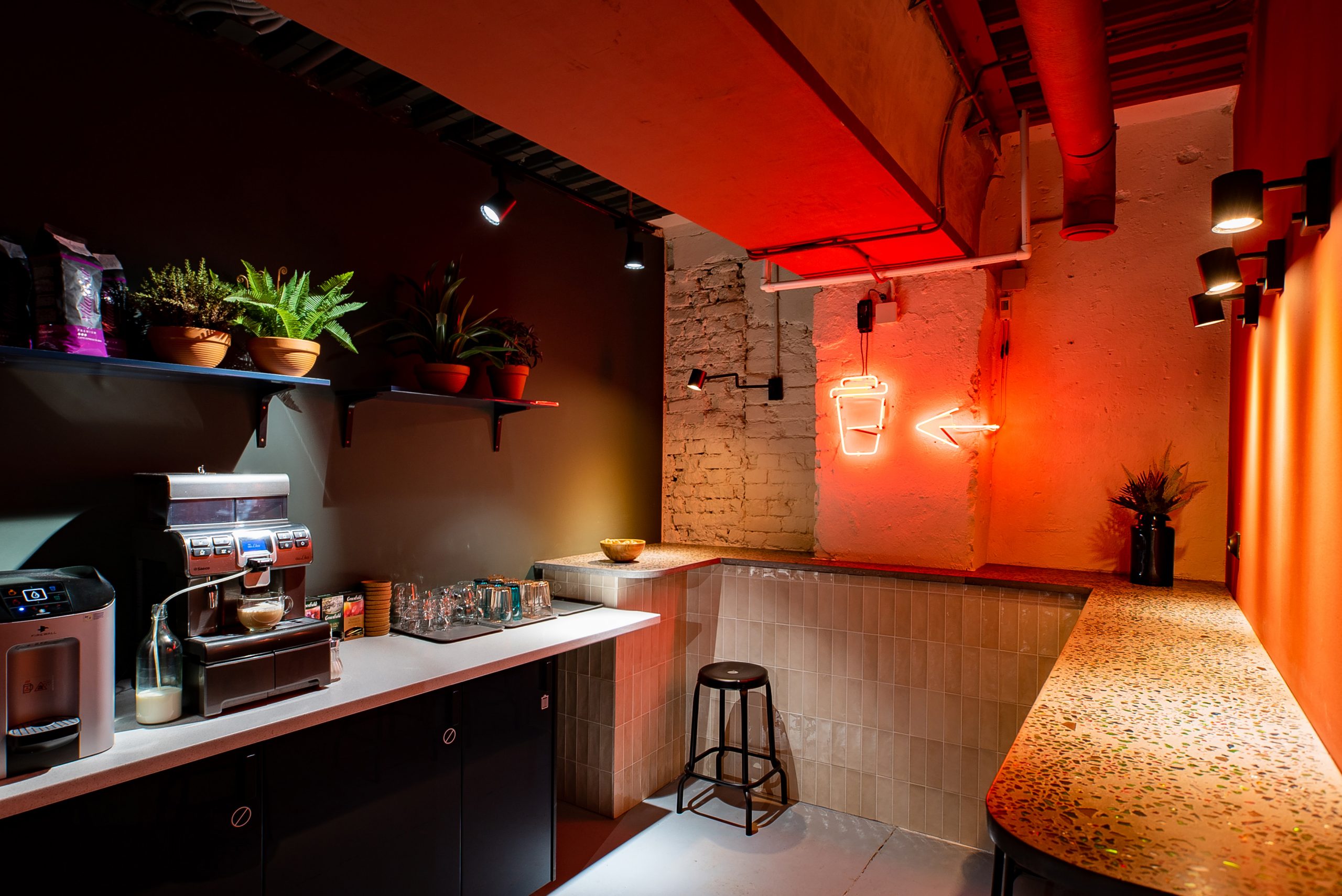 Кроме того, в пространстве находится 5 переговорных комнат и открытый подиумный лекторий с библиотекой, организованной по принципу букшеринг. Для резидентов также доступны офисное оборудование — принтер, сканер — кофе, чай, снеки, кухня, зона отдыха с плейстейшн и душевая.