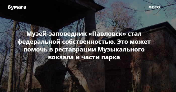 Государственный музей-заповедник «Павловск» под Петербургом перешел из городского подчинения в федеральное. Теперь он в федеральной собственности, следует из опубликованного распоряжения правительства России.
