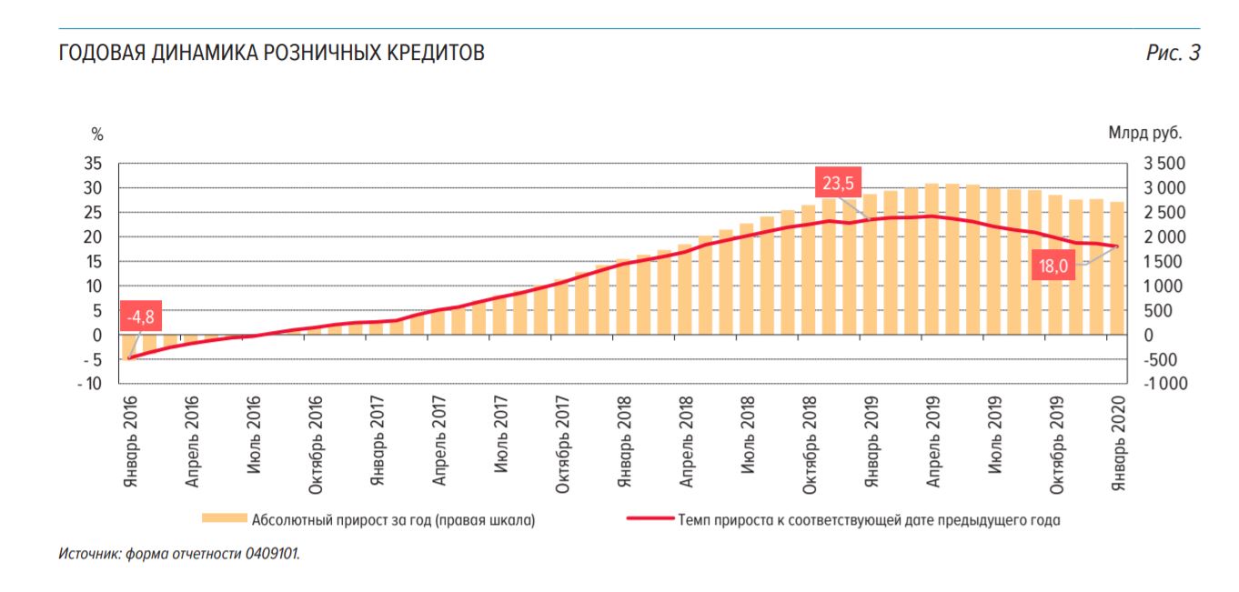 - Темпы роста розничного кредитования в 2019 году замедлились по сравнению с рекордным 2018 годом, но незначительно — 18,5% против 22,4%, в сегменте необеспеченных потребкредитов — 20,9% против 22,8%. С осени 2019 года рост начал быстро замедляться из-за ограничений, введенных ЦБ, и к январю 2020 года снизился до 18%.