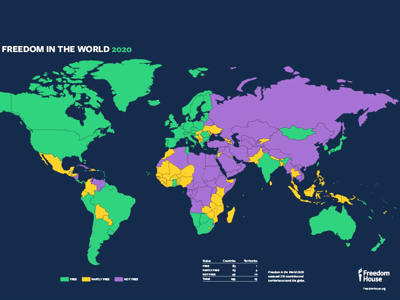 Американская неправительственная организация Freedom House в ежегодном рейтинге "Свобода в мире-2020" отнесла Россию к числу несвободных стран. Причем РФ оказалась в одном ряду с африканской страной Конго и Вьетнамом в Азии.