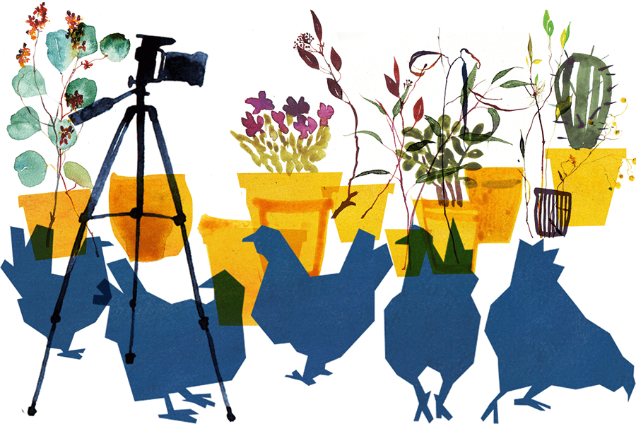 Отдельно от дома на участке стоит фотостудия: в ней много света, стены выкрашены белым, повсюду развешаны и разложены принты, среди которых много пейзажей и портретов кур. «Они замечательные модели», — смеётся Ноа. Одна стена у студии — стеклянная, и летом её можно полностью открыть, чтобы работать, наслаждаясь свежим воздухом и видом на лес. Ноа показывает свои фотографии: серии пейзажей, серии «постельных куч» — в каждом отеле, где он останавливается, он снимает разобранную кровать со скомканным одеялом. Затем раскладывает на столе портреты людей.
