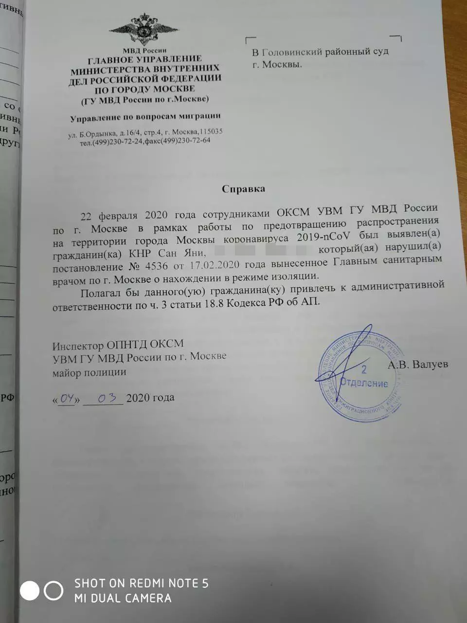 «22 февраля 2020 года в 20 час. 40 мин. по адресу … в рамках работы по предотвращению распространения на территории города Москвы коронавируса 2019-nCoV был(а) выявлен(а) граждан(ка) КНР Сан Яни», сообщается в протоколе административном нарушении. Из-за этого правонарушения потом будет принято решение о депортации Сан Яни. Сам протокол составлен неким полицейским Валуевым. Как уверяет адвокат Сергей Малик, Валуев и его коллега Мельников — это два полицейских, которые под предлогом борьбы с распространением коронавируса занялись отловом граждан Китая для их последующих депортации. «Сотрудники правоохранительных органов используют эту ситуацию для набивания себя определенных баллов, плюсиков, галочек. За раскрываемость преступления они получают баллы», — поясняет Малик.