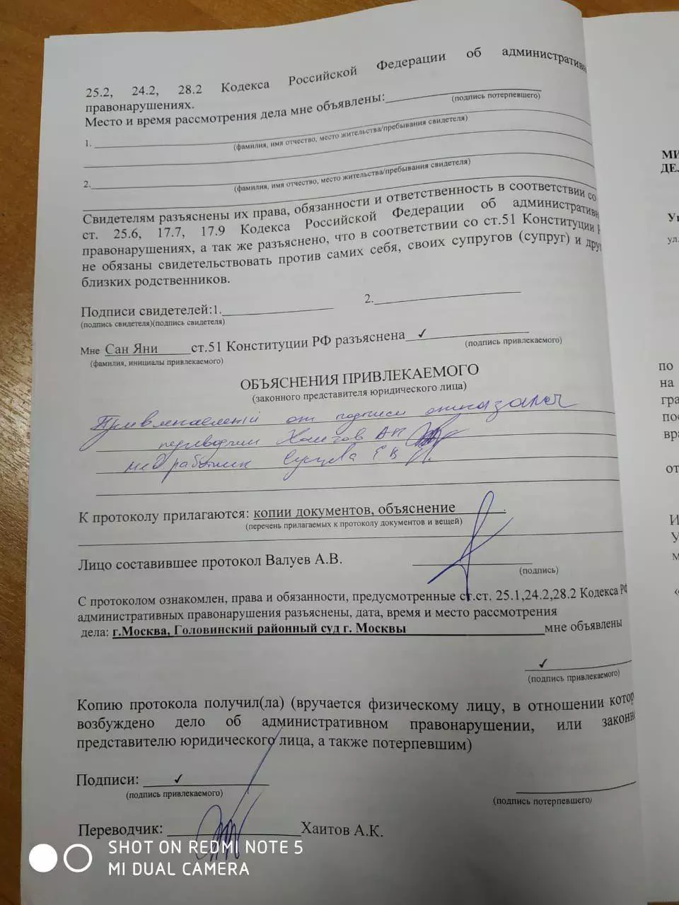 «Два сотрудника, которые по всей Москве составляют эти протоколы об административном правонарушении, что, мол, якобы они вылавливают [китайцев] в других местах, [ отличных] от постоянного места жительства, и соответственно, они якобы нарушают режим пребывания на территории РФ, в Москве, обусловленный данным карантином. Везде в протоколах присутствует один и тот же переводчик, который фиксирует якобы факт отказа от подписи со стороны, никто им никаких подписей не предлагает поставить. Объяснения написаны под копирку печатным текстом этими сотрудниками. Рапорта тоже под копирку, они там меняют фамилии и имена, даты рождения, ну, может быть, адреса (якобы они их вылавливают)», описывает адвокат слаженную схему работы полицейских. По его словам, никакого вылавливания на самом деле не было, китайцев выдергивали из их домов: «Берут от балды адрес, по своей территории, и указывает там, в документах».