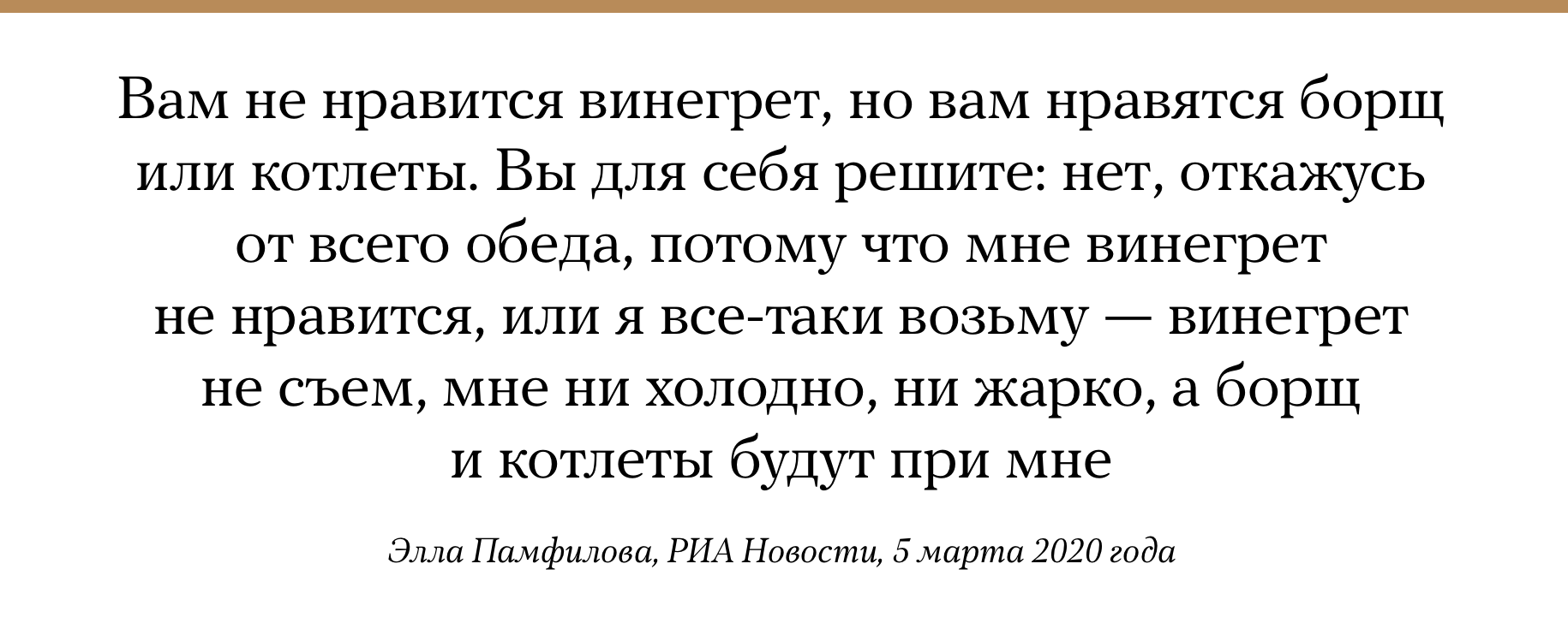 Глава ЦИК Элла Памфилова объяснила, почему нельзя провести голосование по каждой отдельной поправке в Конституцию. По ее словам, это «технологически немыслимо», потому что все поправки невозможно уместить в один бюллетень. Памфилова сравнила пакет поправок с комплексным обедом, который лучше взять целиком и не съесть в нем одно нелюбимое блюдо, чем отказаться от него полностью.