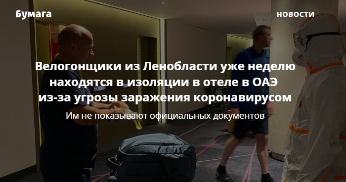 Велогонщики из Ленобласти еще в конце февраля прилетели в Абу-Даби для участия в гонке «Тур ОАЭ», но ее отменили в связи с распространением коронавируса. Как отмечает «Газпром-РусВело», вскоре всех участников гонки попросили остаться в отеле и не выходить оттуда.