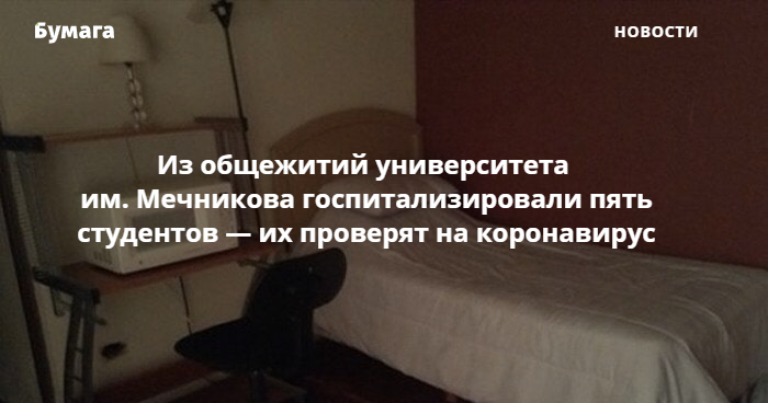 Из общежитий СЗГМУ им. Мечникова в Петербурге, где 4 марта ввели карантин по коронавирусу, госпитализировали пять студентов. Об этом рассказал ректор университета Сергей Сайганов.