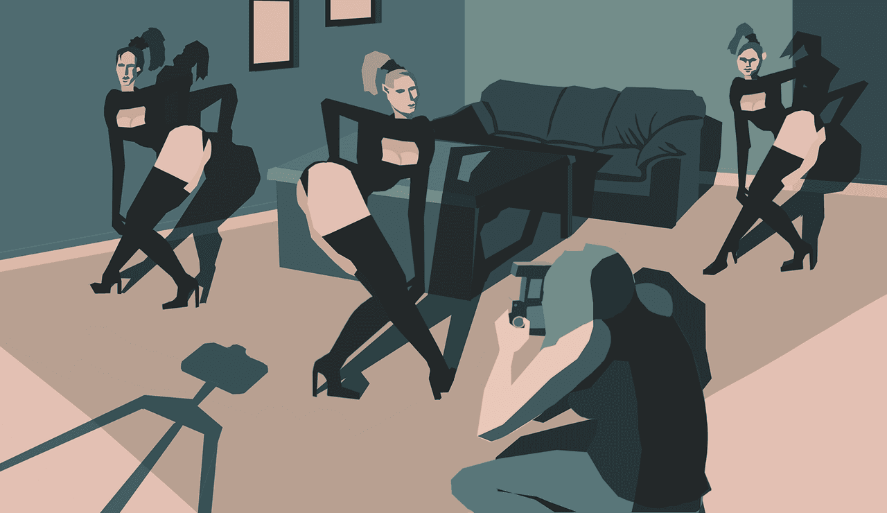 Со временем я наработала базу кадров и напечатала девочкам мануал, чтобы они просто позировали по шаблону. Снимать нужно было классические кадры, которые все видели на сайтах проституток, в рекламе стриптиз-баров и бог знает где ещё.