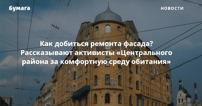 Петербургские активисты движения «Центральный район за комфортную среду обитания» опубликовали во «ВКонтакте» инструкцию, как добиться ремонта фасада. По их словам, для этого потребуется «наглые и неординарные решения».