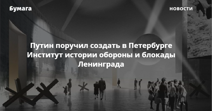 Президент России Владимир Путин поручил до 1 сентября 2020 года подготовить предложения по созданию в Петербурге Института истории обороны и блокады Ленинграда. Приказ опубликован на сайте Кремля.