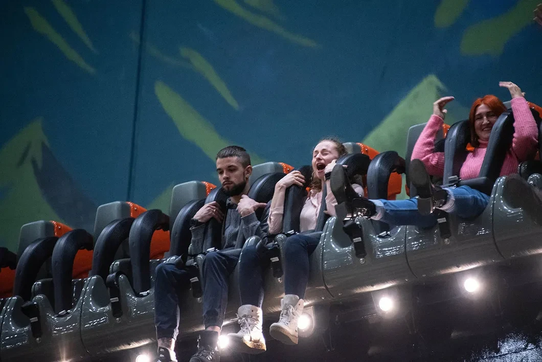 15 человек перед нами в очереди на «Гонку мечты» стоят еще полчаса, что довольно долго для аттракциона, который меньше чем за минуту проносит вас по 50-метровому подобию американских горок в VR-очках, имитируя гонки будущего между башнями Москва-сити. И вроде бы эта картинка должна символизировать тезис «как похорошела Москва», но остается непонятным, какой смысл тогда был выстраивать целый аттракцион с горками, если серую действительность вам все равно закроют тесными и невероятно давящими очками?