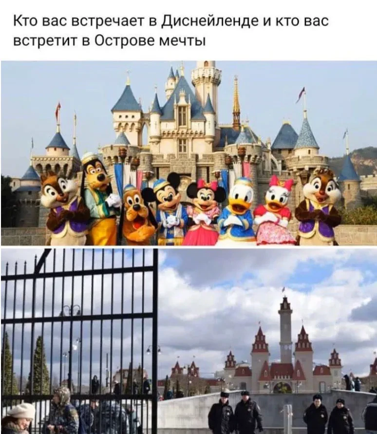 Спустя неделю после открытия «Острова мечты» интернет ломится от обидных мемов в его адрес: начиная с фотосравнений «Кто вас встречает при входе в Диснейленд в Европе и в Диснейленд в России» (во Франции — сказочные существа Диснеевских фильмов; в России — полицейские, стоящие вдоль ограды) и заканчивая грустными афоризмами из серии «Какие мечты, такой и остров».