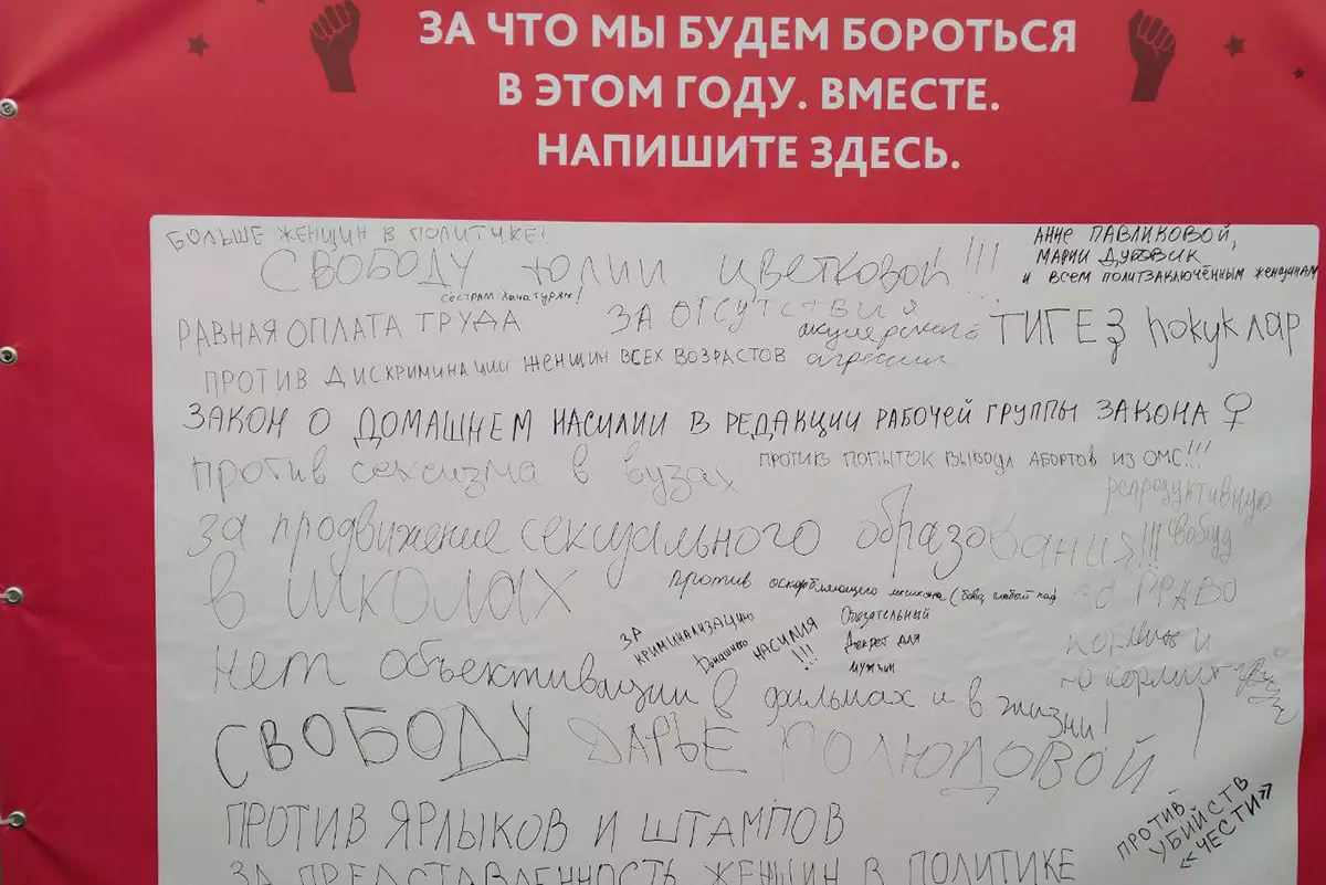«Хочу, чтобы женщины и мужчины были равноправными, хочу, чтобы в моей стране приняли закон против домашнего насилия, хочу вернуть 8-му марта историческое значение этого дня» — выразила общее настроение митинга в беседе со мной работница детского музыкального театра, державшая плакат, призывающий к равноправию.
