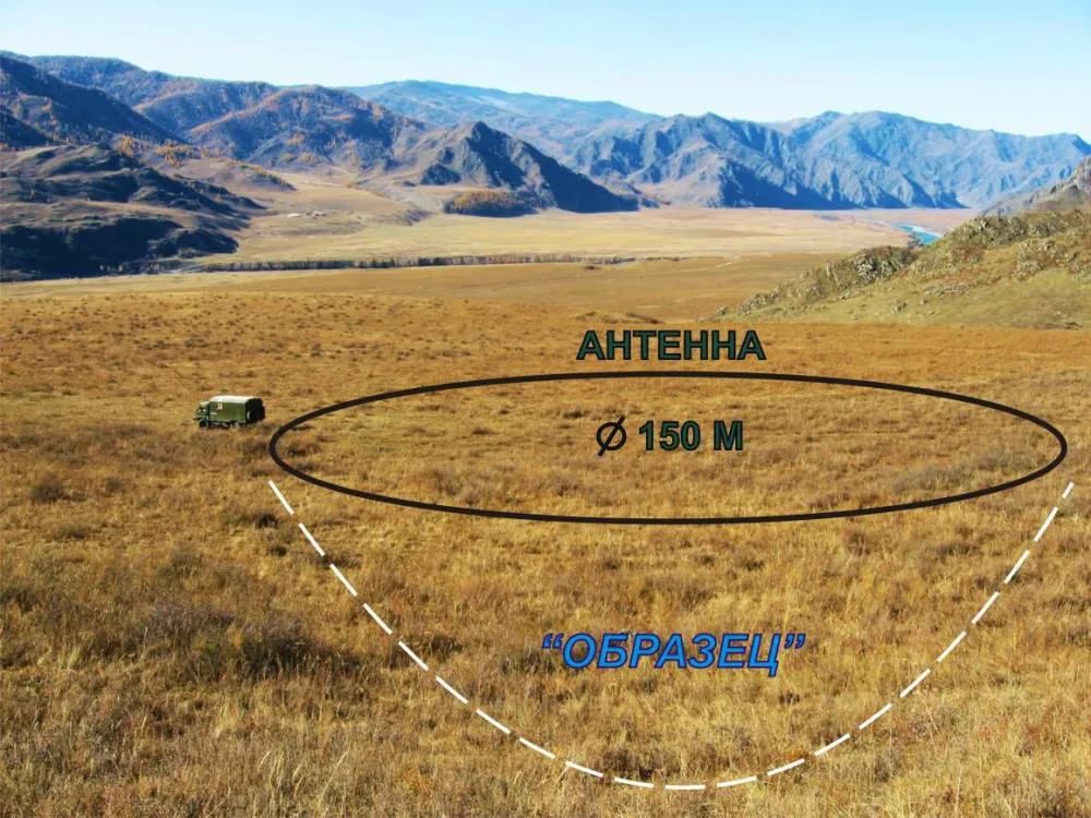 Методика измерения с помощью прибора «Гидроскоп» в ее классическом варианте состоит в следующем. На поверхности земли раскладывается виток кабеля в форме окружности диаметром порядка 100 м, который служит для возбуждения сигнала ЯМР от подземных вод и одновременно является антенной для регистрации этого сигнала (рис. 2). Резонансное возбуждение производится переменным током амплитудой до сотен ампер с частотой, соответствующей ларморовской частоте прецессии протонов в земном магнитном поле в месте измерения (типичные значения — 1,5– 2,5 кГц). По окончании импульса возбуждения антенна переключается на прием, и в случае наличия подземных вод в антенне наводится экспоненциально спадающий ЯМР-сигнал [3].
