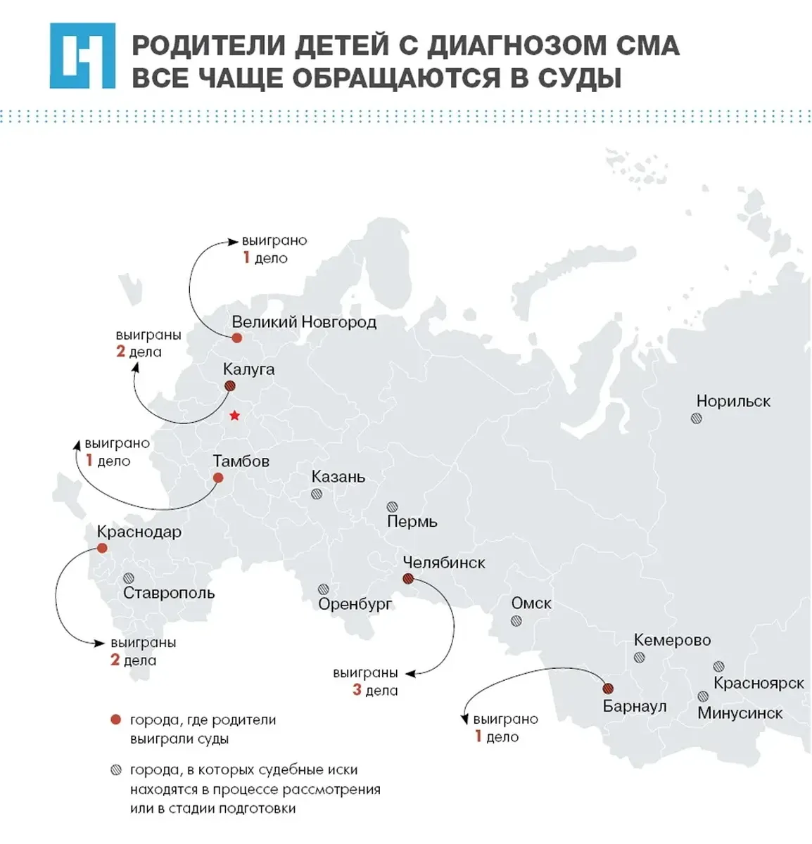 11 марта, спустя несколько часов после нашего разговора, в Калужском райсуде Калужской области Курмышкин выиграл дело уже третьего калужского ребенка со СМА — с припиской о «немедленном исполнении». Решение Железнодорожного райсуда Барнаула о лечении Полины Демидовой «Спинразой» (о чем говорит Курмышкин) — с той же формулировкой о безотлагательности действий — состоялось еще 10 января.