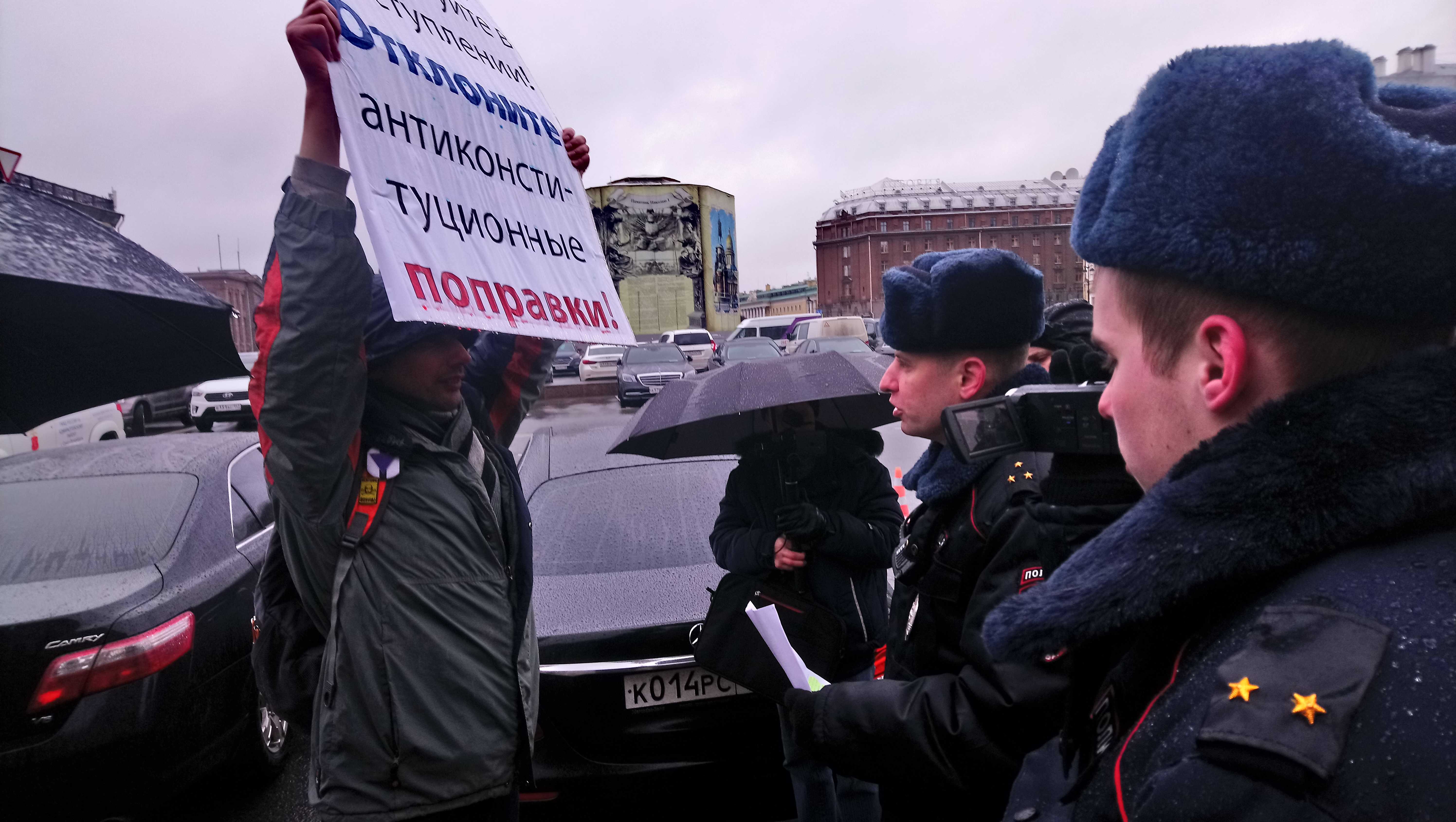 Во время пикетов полицейские задержали активиста "Мирного сопротивления" Дмитрия Негодина. Он стоял с плакатом "Депутаты, не участвуйте в преступлении, отклоните антиконституционные поправки". Следом за Негодиным в автозак отправился сторонник "Бессрочного протеста" Евгений Мусин.
