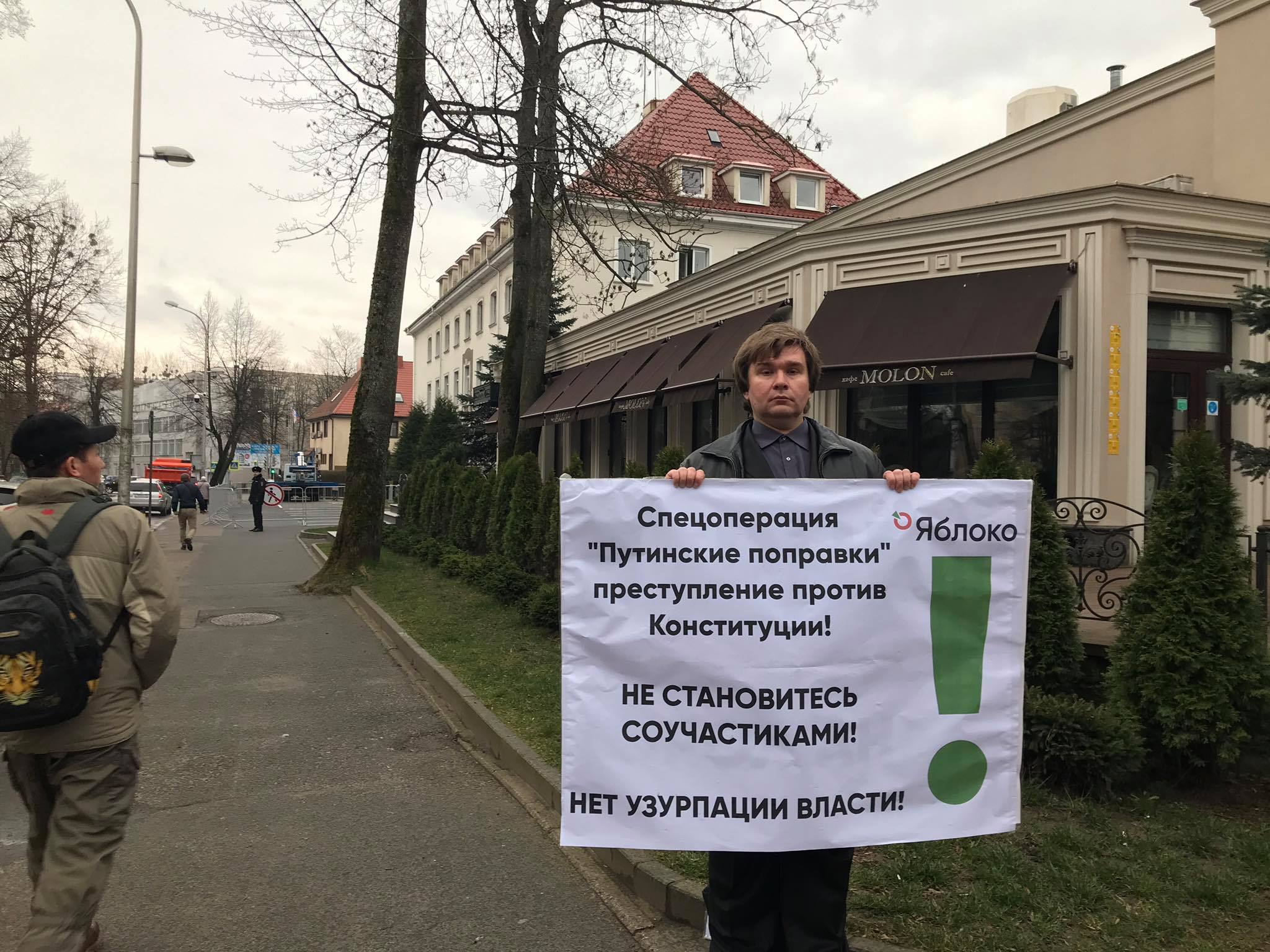 В Вологде пятеро активистов по очереди стояли возле входа в здание Заксобрания. Пикет продлился около двух часов. Задержаний за время акции не было. Последним с плакатом стоял председатель регионального отделения "Яблока" Дмитрий Тарасов. Он поправки и "обнуление" воспринял как личное оскорбление.