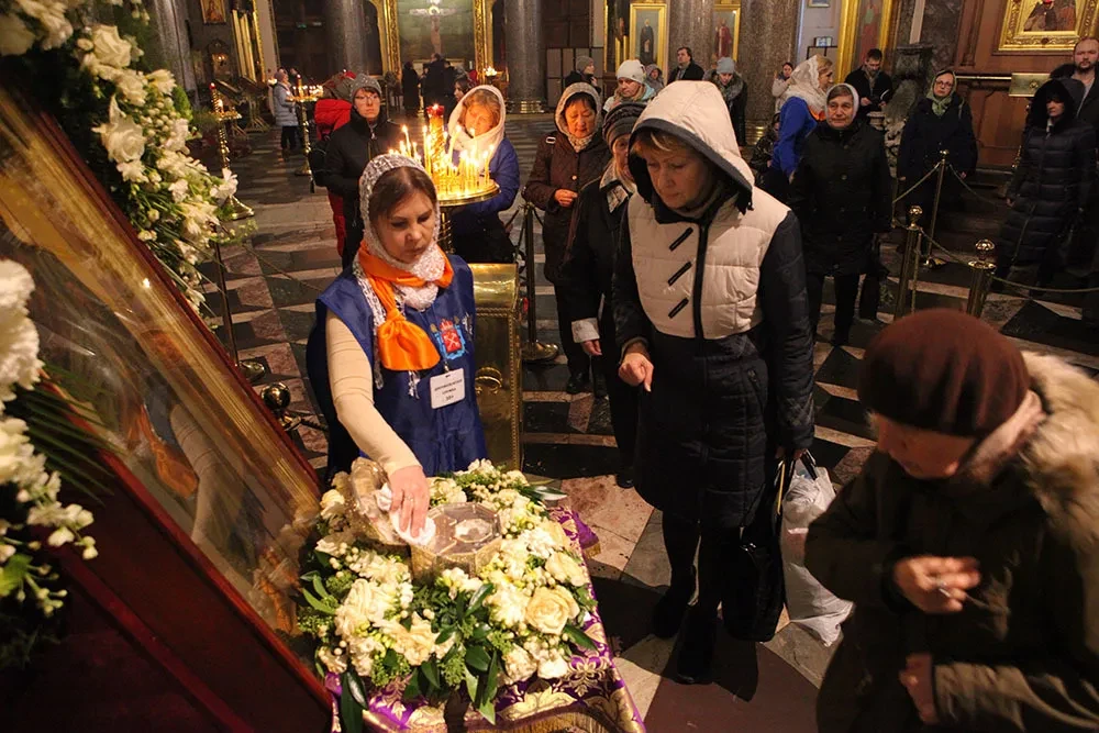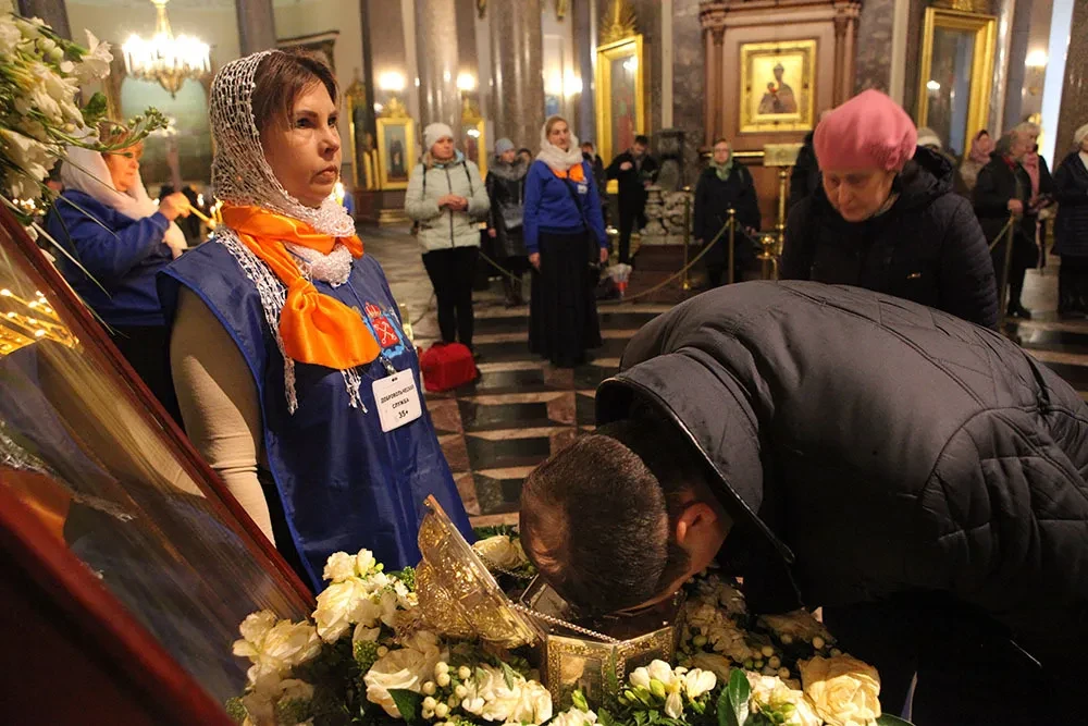 В первый день поклонения, 10 марта, Казанский собор был заполнен верующими, жаждущими прильнуть губами к стеклу на поверхности ковчежца. К четвергу очередь немного поредела. В середине рабочего дня я насчитала человек шестьсот. Мужчины и женщины, с детьми за ручку и в колясках, больше пожилых, чем молодых.
