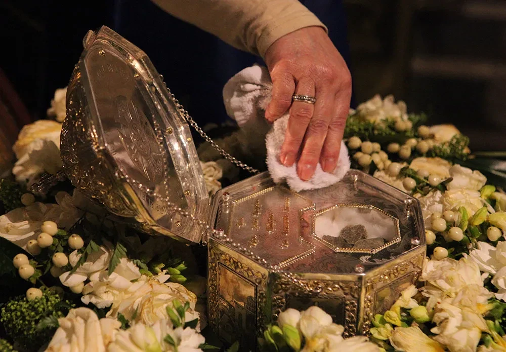 Когда я вернулась к очереди, моих бывших соседок уже не было. Пришлось занимать заново. Двигались мы очень быстро. Не прошло и получаса, когда передо мной оставалось четыре человека. Вдруг все застопорилось. Высокий молодой мужчина в синей куртке упал перед ковчежцем ниц и поцеловал пол. Женщины, стоявшие за ним, почтительно отступили. Молодой человек встал, подошел к ковчегу, поцеловал стекло. Волонтер махнула тряпочкой. Две женщины передо мной приложились и отошли. Волонтер попросила подождать: через ограждение пропускали молодую маму с коляской. Верующие с детьми целуют ковчег вне очереди.