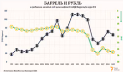 За минувшую неделю на фоне спада цен на нефть сразу на четверть курс российского рубля к доллару США снизился втрое меньше - на 8,5%. Однако, если иметь в виду среднегодовые цены на нефть, подобные колебания случаются нечасто.