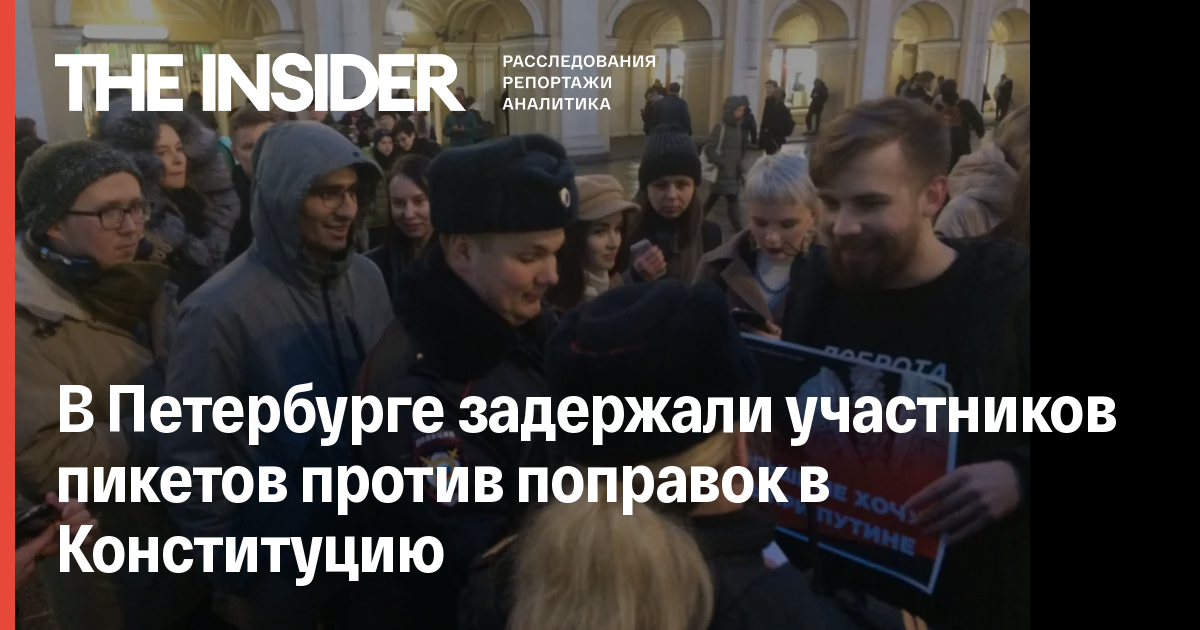 Среди задержанных — активист Александр Комельков, который стоял с плакатом «Нет путинским поправкам в Конституцию!», и член Либертарианской партии в Петербурге Иван Остапчук, который стоял с плакатом «Я больше не хочу жить при Путине».