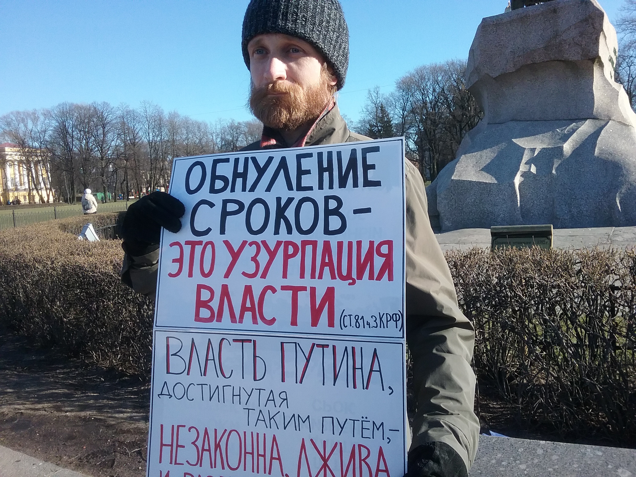 Активисты инициативной группы "Мирное сопротивление" вставали по очереди около памятника Петру Первому с плакатами, призывающими судей Конституционного суда не одобрять поправки к Конституции. На других плакатах обнуление президентских сроков называлось узурпацией власти. Полицейские подходили к активистам , переписывали их паспортные данные, потом стали объявлять в мегафон, что одиночные пикеты, связанные одной темой, считаются несогласованной массовой акцией. Через 20 минут после начала пикетов на площади появился наряд ОМОНа, начались задержания. На данный момент полиция задержала более 10 человек, в том числе председателя "Открытой России" Анастасию Буракову.