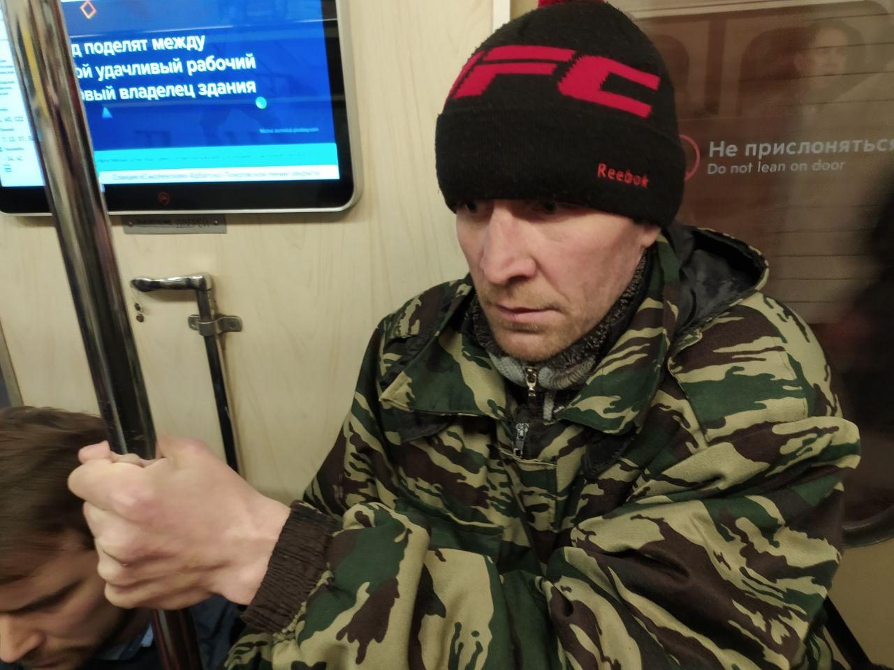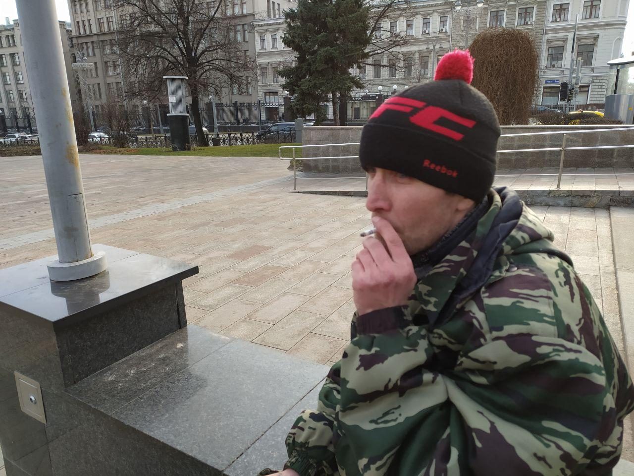 Андрею Кузнецову 34 года. Он инвалид второй группы, приехал в столицу из города Киселевска Кемеровской области. На невысоком мужчине рюкзак, шапка UFC, камуфляжный костюм, в зубах синий «Бонд компакт». Передвигается медленно, но сосредоточенно, почти торжественно. Ругается, когда пытаешься помочь с открытием дверей, — все только сам. Бычок доносит до мусорки: «У вас тут чисто слишком, [чтобы] на пол кидать».